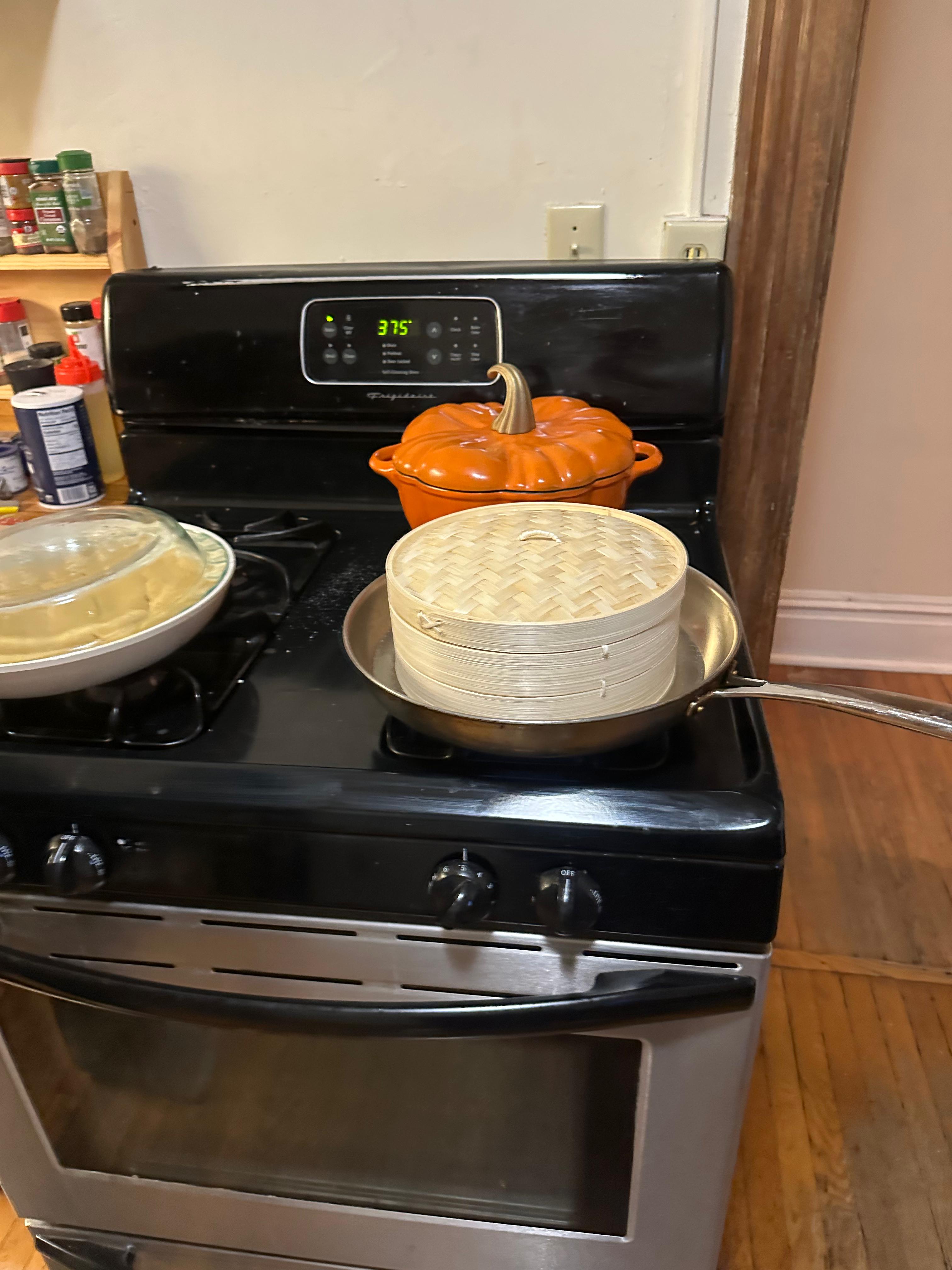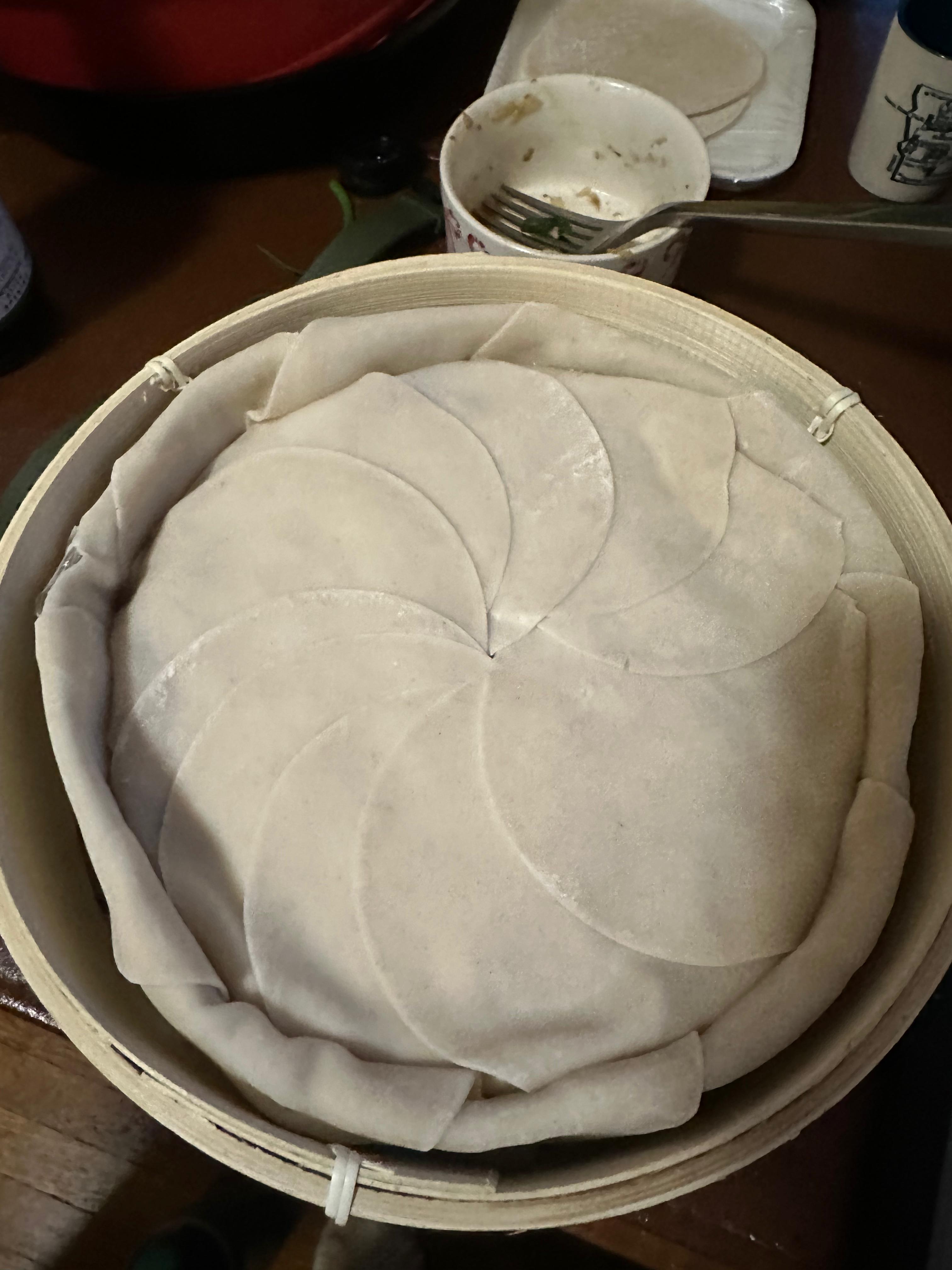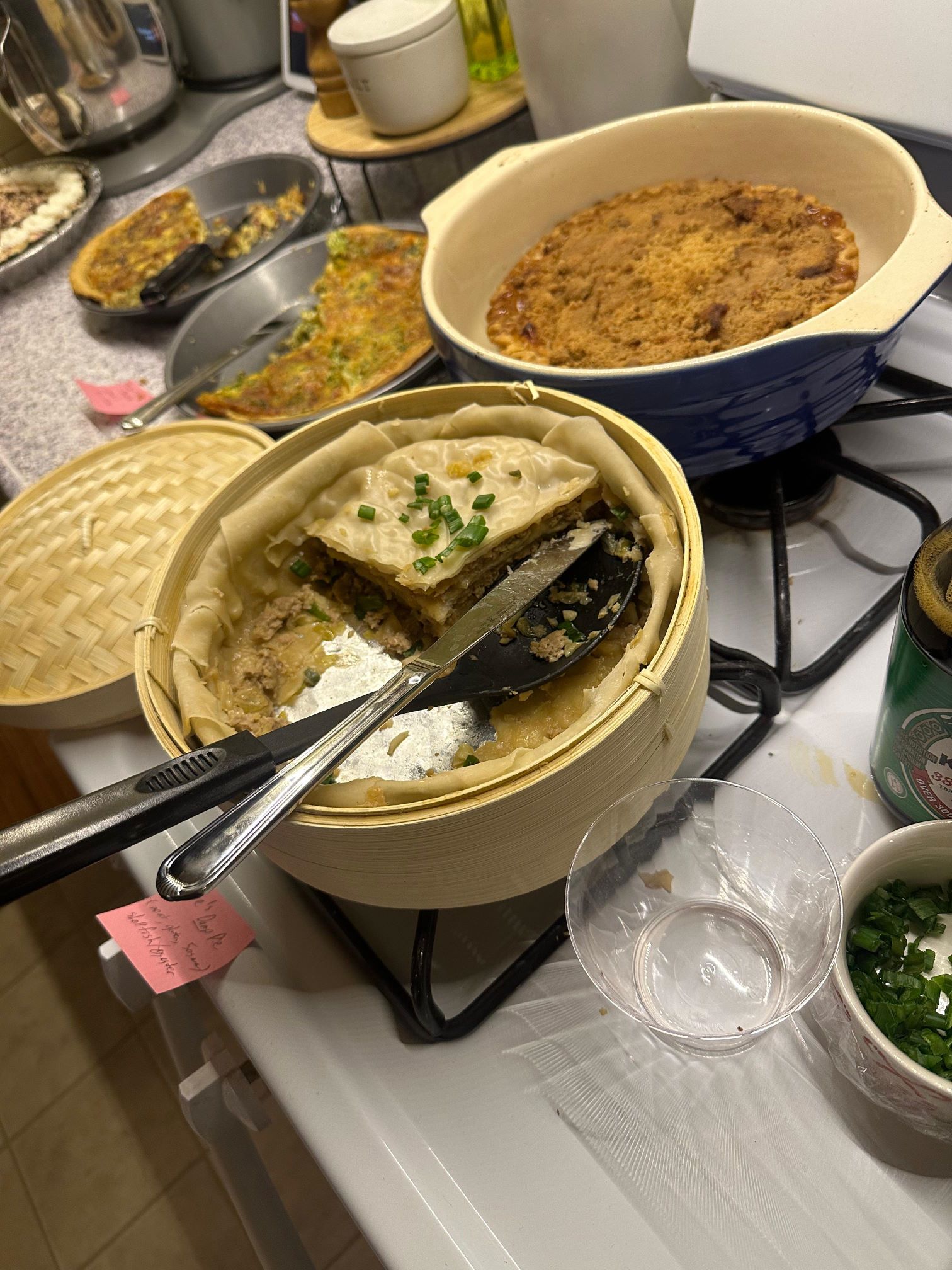 The concept was making a steamed soup dumpling pie, with layered dumpling wrapper instead of crust. It was very easy and good enough to add to a regular rotation.